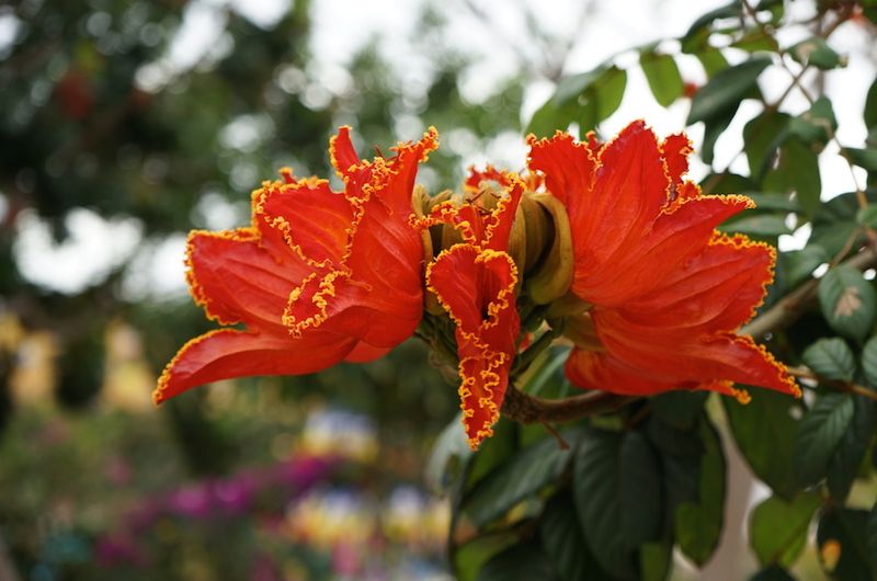 The African tulip tree is a giant among flowers, boasting impressive, bell-shaped blooms that scream ‘look at me!’ With their fiery orange petals, they tower over most garden inhabitants, offering a grand display.