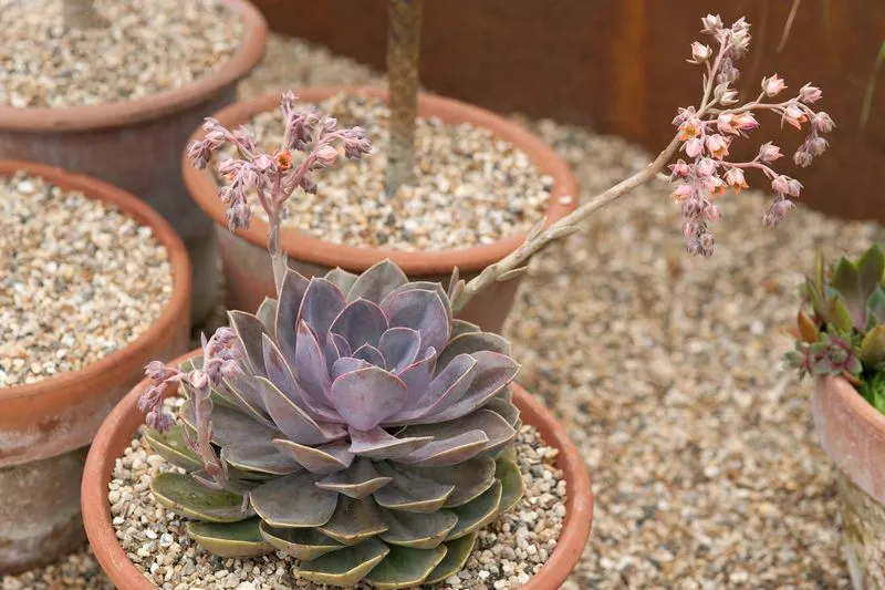 Echeveria Perle von Nurnberg impresses with pastel tones. This rosette-forming succulent is ideal for sunny windowsills. Its fleshy leaves store water, making it drought-tolerant.