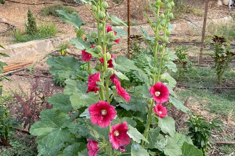 Hollyhocks, with their towering spikes of flowers, create a dramatic backdrop in gardens. These biennials or short-lived perennials thrive in sunny positions with well-drained soil. Blooming from mid-summer to early fall, they offer nectar-rich flowers that entice bees and butterflies. Their tall stature makes them ideal for borders or against walls, adding vertical interest to garden designs. Hollyhocks require moderate care, rewarding gardeners with their impressive blooms and pollinator appeal.