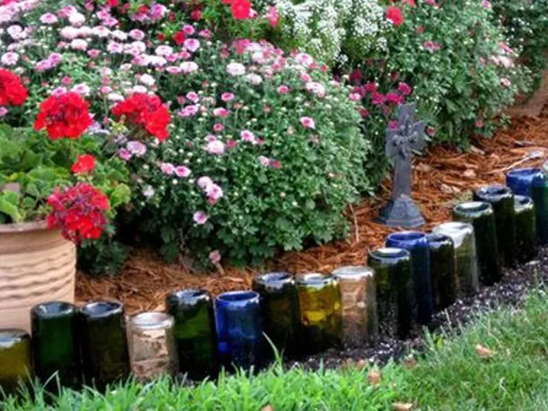 Ever consider wine bottles as garden borders? Their vibrant colors and uniform shape make them ideal for creative edging. Upend them, bury necks in the soil, and let their bases catch the sun.