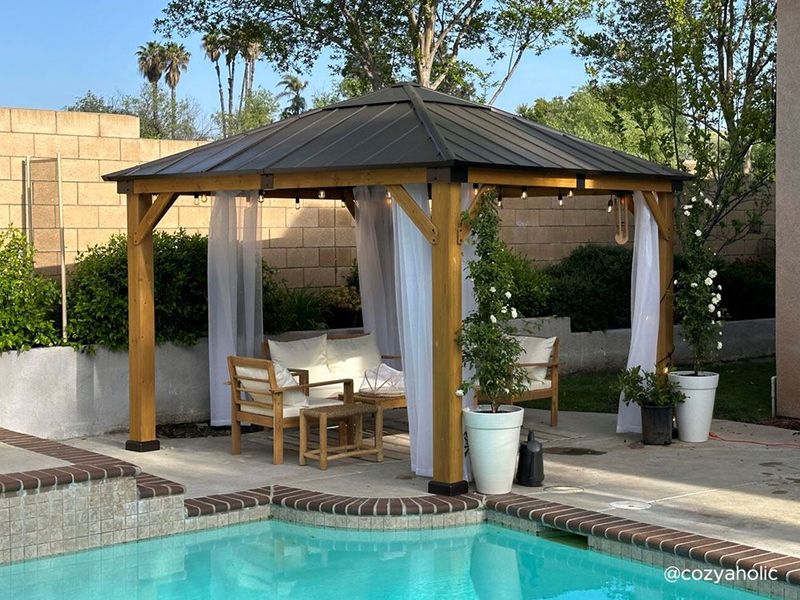A poolside gazebo offers the ideal blend of shade and style, perfect for lazy summer days by the water. Soft curtains provide respite from the sun, while plush loungers invite relaxation. Whether it’s poolside cocktails or a quiet afternoon read, this gazebo enhances your outdoor living experience. Consider adding elements like a mini-fridge or a sound system to elevate your poolside retreat. The tranquility of water combined with the comfort of a well-designed gazebo creates a personal paradise in your own backyard.